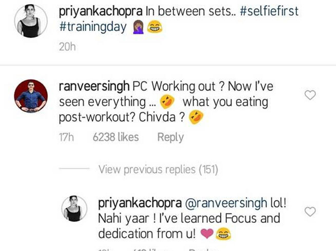 प्रियंका भी रणवीर के कॉमेंट का जवाब देने से नहीं चूकीं। उन्होंने लिखा, नहीं यार! मैंने फोकस करना और डेडिकेशन तुमसे सीखा है।'